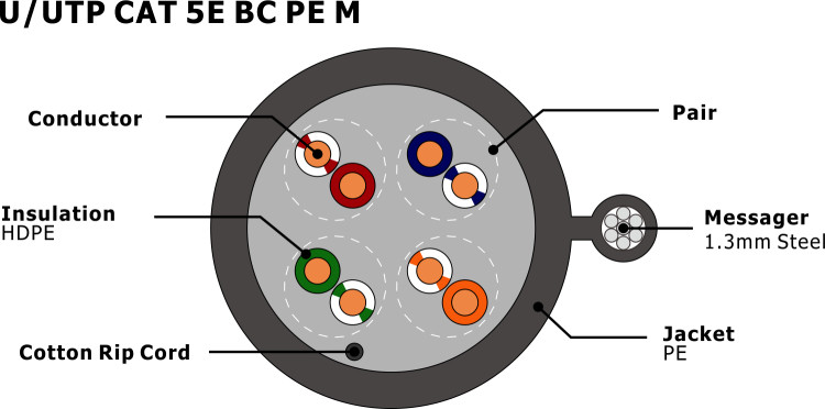 | シールド: | UTP,シールドなしの扭曲ペア | 製品名: | U/UTP CAT5E PE、メッセンジャー付き |